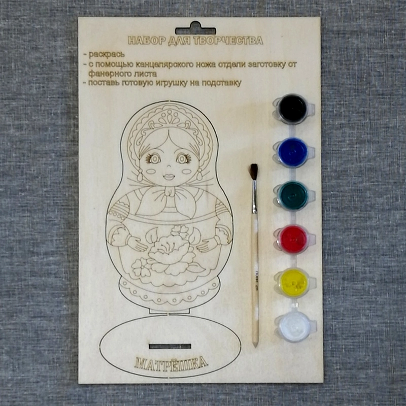 в набор входят: матрёшка на подставке, краски, кисточка