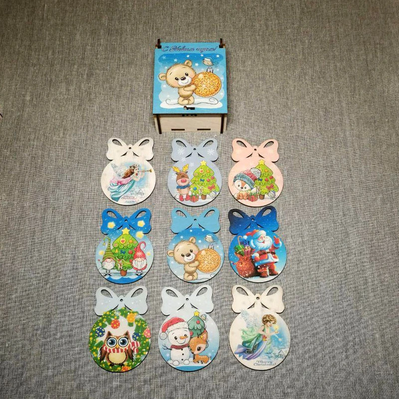 Новогодние игрушки в подарочной коробочке из дерева.