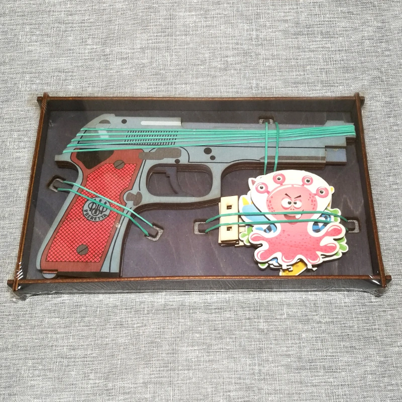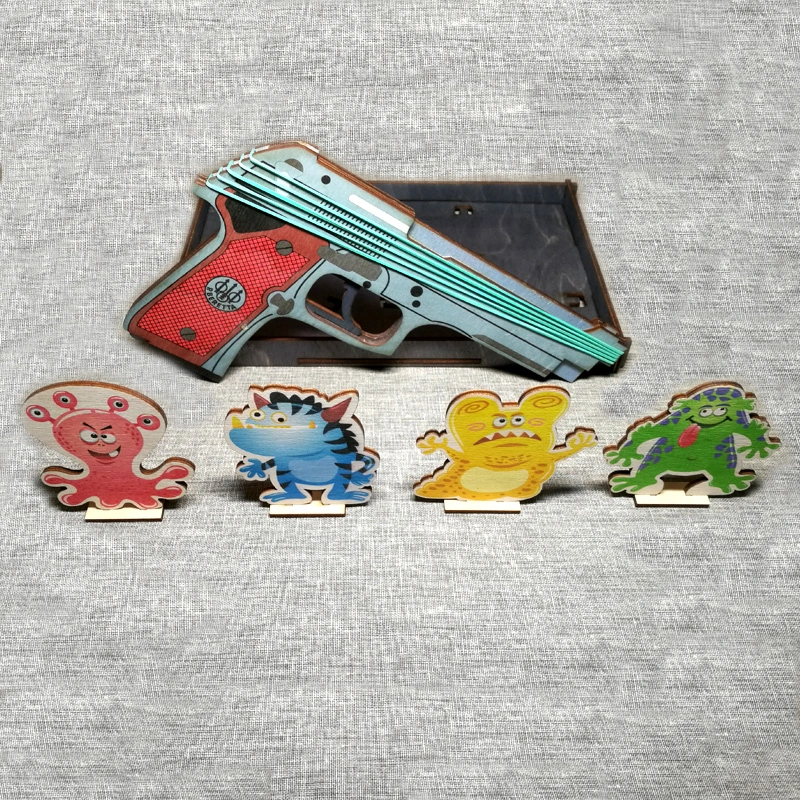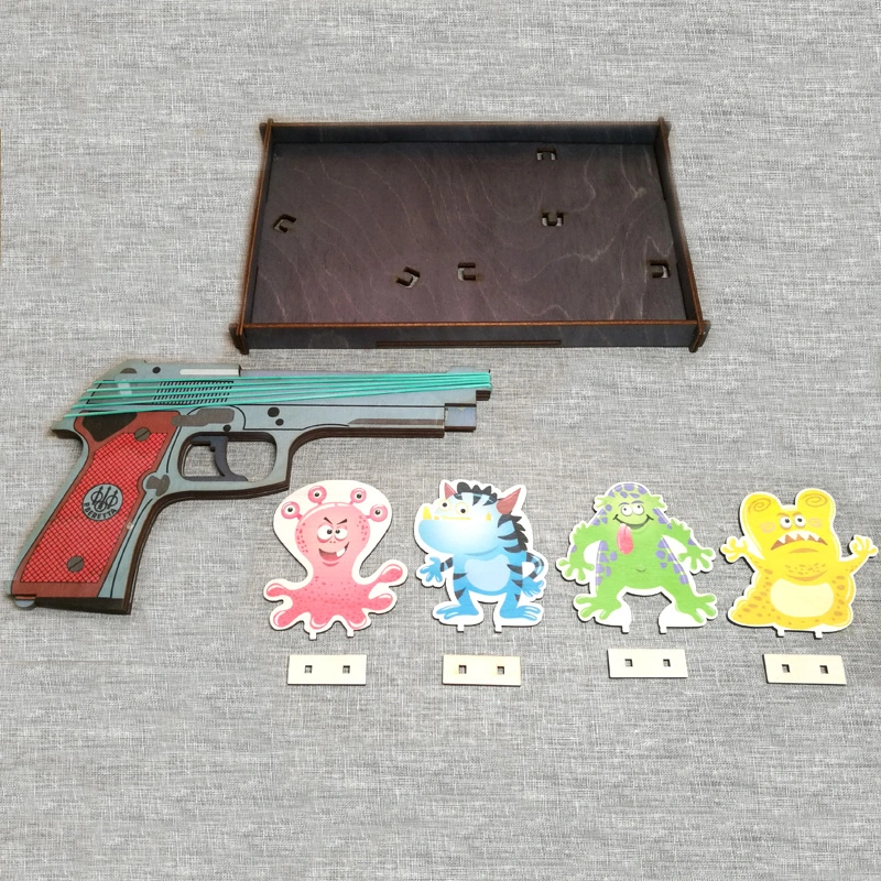 Состав: резинкострел из дерева цветной пятизарядный, мишени 4 штуки, подставки для мишеней 4 штуки.