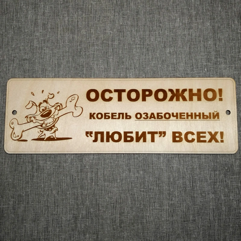 Табличка из дерева "Осторожно! Кобель озабоченный "любит" всех!"